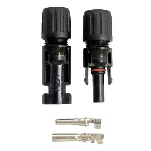 El juego de Conectores Paneles solares es indispensable para poder hacer una conexión segura y estanca de los módulos fotovoltaicos. Consta de una pareja de conectores, un conector Macho y otro conector Hembra que encajan a la perfección con los conectores que ya vienen incluidos en el panel. Es un tipo de conector muy estandarizado ya que la inmensa mayoría de los fabricantes utilizan este tipo de conector, por lo que la compatibilidad es máxima. Para poder conectar de manera apropiada una panel fotovoltaico a un sistema solar se recomienda siempre la utilización de este tipo de conector.